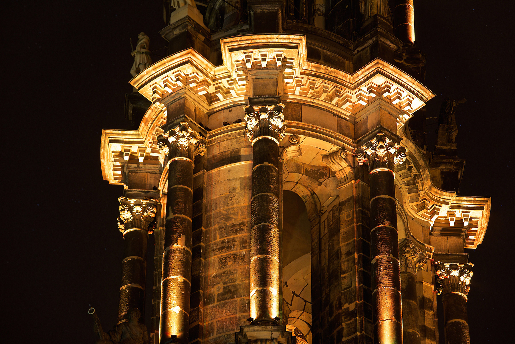 A Baroque Masterpiece: A masterpiece of Baroque architecture, the Dresden Cathedral (c. 1738) is one of the city’s foremost historic landmarks. Along with the city center it was virtually destroyed in the bombing, and then meticulously rebuilt — stone by stone — in the 1980s. With its prominent setting on the River Elbe, the Cathedral is a key component of Dresden’s famed Baroque skyline. A kinetic light installation in such a prominent setting, towering 275 feet above the heart of the city, became an artwork on the scale of the cityscape.