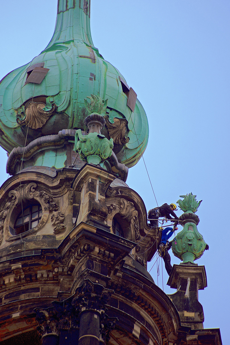This brief video (1:34 mins.) shows the “climbers” in action as they scale the bell tower of the Dresden Cathedral like human ants, busily installing a network of LED uplighting fixtures to animate the facade with breathing waves of light.
